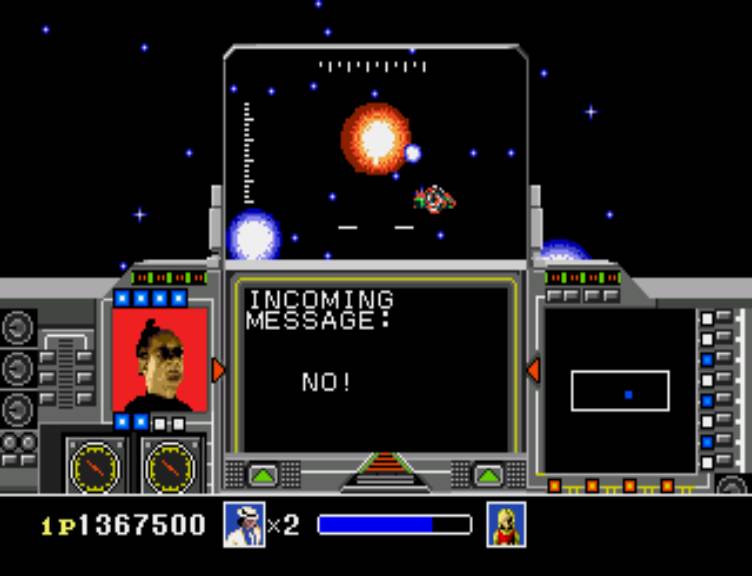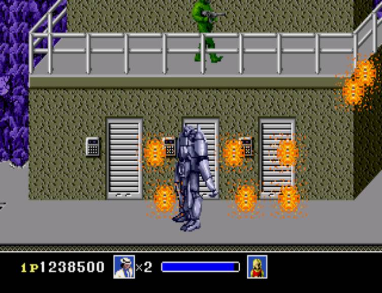 Mas há mais a ter em conta. Ocasionalmente quando libertamos algumas crianças desce um meteorito do céu. Se o apanharmos, então MJ transforma-se num robot que lhe permite voar, disparar raios laser ou mísseis teleguiados, embora estes últimos também consumam da sua barra de vida. De resto não temos qualquer power up nesta versão, com a barra de vida de MJ a regenerar gradualmente com cada criança salva. O último nível já tem mecânicas de jogo completamente distintas. Aqui aparentemente pilotamos, na primeira pessoa, uma nave em pleno espaço onde teremos várias naves inimigas para destruir, particularmente a que contém o vilão principal.