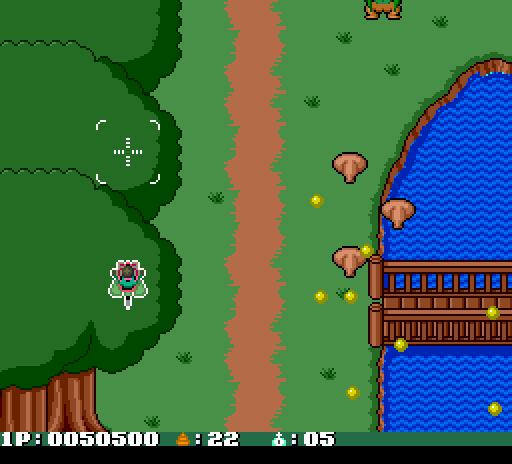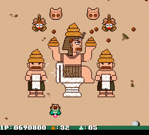 De resto o jogo em si não é muito longo, possuindo apenas 4 níveis que são divididos em duas fases, a primeira com um mini-boss, outra com o boss principal. No que diz respeito aos visuais em si, bom, os cenários não são nada de especial, consistindo em florestas, lagos, desertos ou ruínas, sempre com os típicos poios em forma helicoidal. Já os inimigos, a história é completamene diferente e anda tudo à volta de humor escatológico. Podemos ter sanitas no chão que nos atiram projécteis castanhos, caranguejos com rabos de gente, gorilas que metem a mão no rabo e nos atiram fezes, pilas voadoras que disparam bolas amarelas, é todo um festim de coisas bizarras a acontecer no ecrã! Nada de especial a apontar aos efeitos sonoros que cumprem o seu papel e a banda sonora, apesar de não ser propriamente memorável, também não é desagradável.