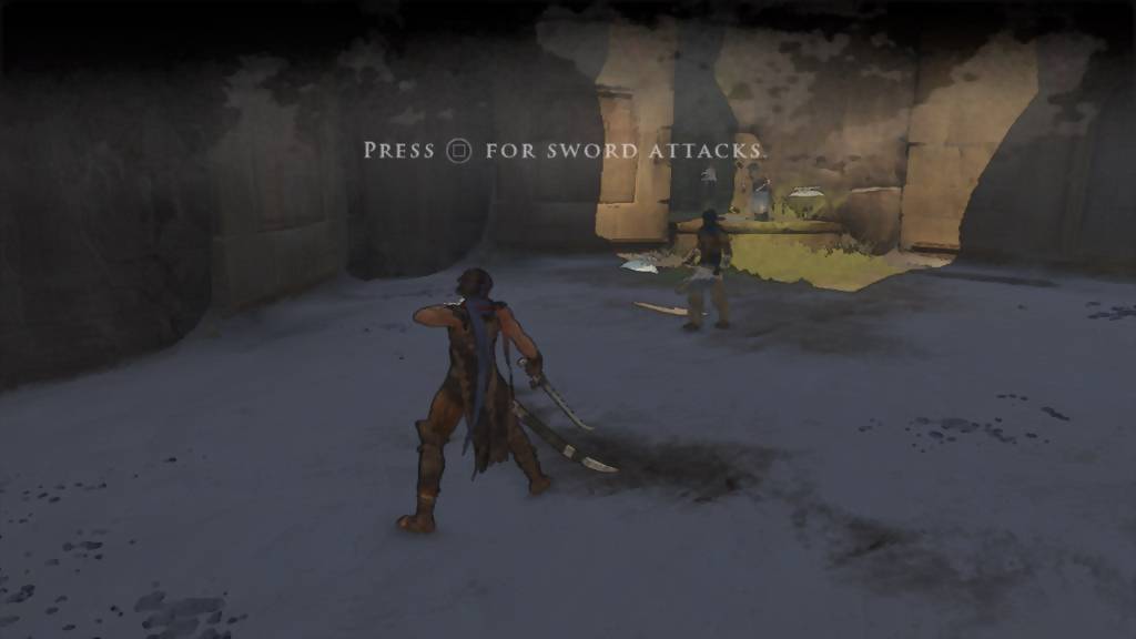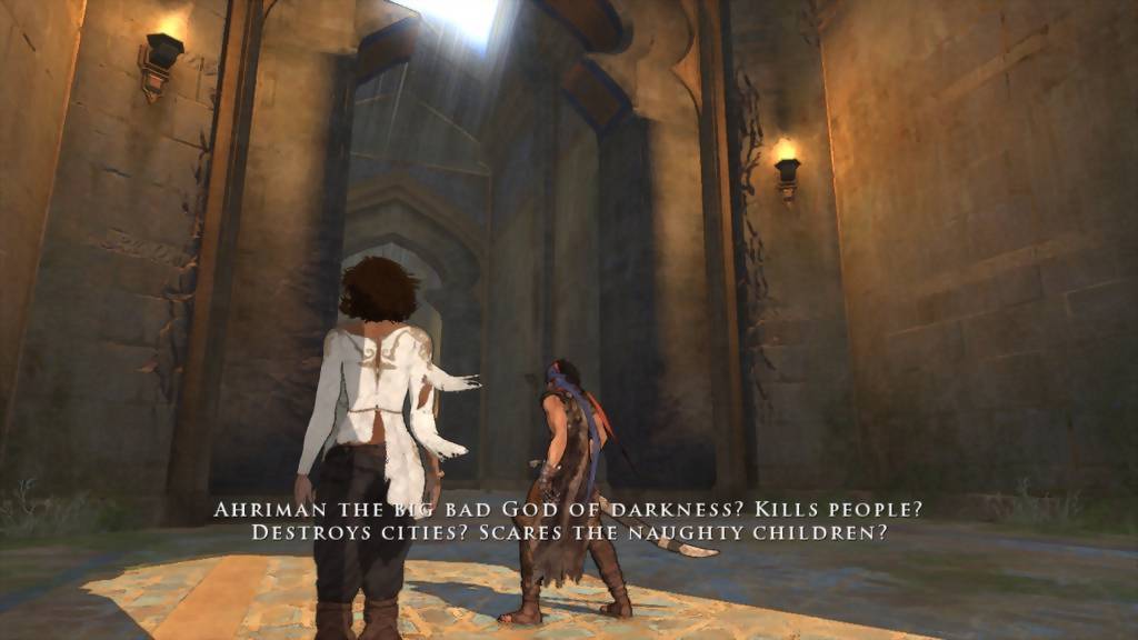 Antes de irmos para o que o jogo tem de melhor, convém dar algum contexto da sua história. Aqui nós encarnamos uma vez mais no afamado príncipe, agora relegado a um mero tomb raider, mas acredito que a sua personagem ainda nos traria algumas surpresas caso as eventuais sequelas que a Ubisoft teria planeadas tivessem sido lançadas. É que muito pouco da sua pessoa e seu passado é revelado ao longo do jogo. Aparentemente este regressaria de uma bem sucedida caça ao tesouro mas acaba por se perder no deserto, quando encontra a jovem e bela Elika, princesa de um reino algures no meio do deserto e que estava a ser perseguida por soldados. Lá nos decidimos a ajudar e eventualmente vemo-nos envolvidos numa luta para travar o regresso de um poderoso demónio cujo povo daquele reino agora em ruínas durante muitos anos lutaram para que não acontecesse. Para impedir que tal aconteça teremos de explorar todos os recantos das ruínas imponentes daquele reino e regenerá-los para que todos os traços das trevas que os assolam desapareçam. Pelo caminho a Elika, que nos irá acompanhar ao longo de todo o jogo, irá ganhar novas habilidades que por sua vez nos permitem avançar mais nalgumas áreas.
