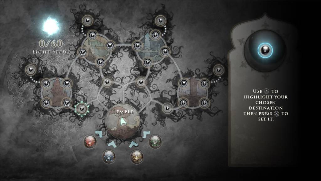 No que diz respeito à exploração contem com as habituais acrobacias que teremos de fazer ao progredir em todas as áreas, ao correr e saltar entre paredes, colunas, suportes de bandeiras, ou até portais mágicos que nos transportam de uma ponta do cenário para a outra. Alguns desses portais coloridos (cujos apenas são activados assim que tivermos desbloqueado as habilidades necessárias para tal) até nos dão algum grau de liberdade ao correr em superfícies como paredes ou tectos, ou até voar em caminhos pré-determinados mas onde ocasionalmente nos teremos de desviar de obstáculos. Acima referi que o jogo está dividido em múltiplas áreas que poderão ser exploradas por qualquer ordem e existem duas fases distintas para cada uma dessas áreas. Antes de a “salvar”, iremos encontrar essa área coberta de uma gosma negra que nos mata caso lhe toquemos e teremos então de seguir uma série de caminhos sinuosos até à sua zona central onde, depois de derrotar o boss que a protege, a poderemos então limpar de toda a corrupção e trevas. A partir dessa altura vemos espalhadas por toda a zona umas quantas esferas de luz que poderemos (e devemos) coleccionar, pois são essas esferas que nos irão desbloquear os portais mágicos coloridos que, em certas zonas, são necessários para chegar ao seu centro, derrotar o boss e tudo o resto. Essa liberdade de exploração até foi algo que me agradou.