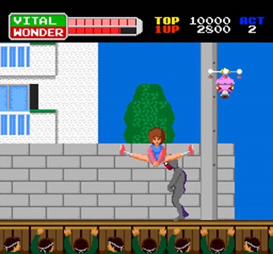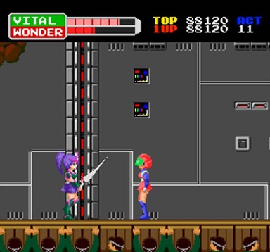 Mas o foco do jogo é mesmo a possibilidade de Momo se transformar numa super heroína e assim ganhar mais poderes. Temos duas maneiras de fazer isto. Na postura frontal, ou seja, voltada para o público poderemos pressionar o botão de ataque repetidamente de forma a que Momo rodopie e se transforme, ou poderemos eventualmente apanhar um power up para o efeito (um mini-furacão que ocasionalmente surge no ecrã). Esta última maneira é a mais segura pois o jogo pausa durante a sua transformação, enquanto que a transformação manual pode ser interrompida caso sejamos atacados por algum inimigo. Nesta forma de super herói Momo consegue saltar muito mais alto e teoricamente os seus golpes são também mais fortes. Para além disso ganha também um hula hoop que pode ser atirado aos inimigos, embora tenhamos de esperar que o mesmo volte até nós para o usar novamente. Algo que convém também referir são as duas barras de energia no topo esquerdo do ecrã: vital e wonder. A primeira é auto explanatória, sendo a nossa barra de vida, cuja é apenas minimamente regenerada entre níveis. A segunda vai-se enchendo com os golpes que vamos aplicando aos inimigos e, a partir do momento que nos transformamos, esta vai sendo consumida lentamente pelo que teremos de ser o mais eficazes possível.