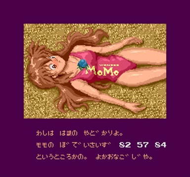 Mas era impossível falar deste Wonder Momo sem também referir o seu fan service. Um dos inimigos que temos de ter especial atenção é uma pessoa com uma máquina fotográfica que se vai deslocando à frente do palco. Assim que este estiver mesmo debaixo da Momo saca-lhe uma fotografia às suas partes íntimas, o que a deixa momentaneamente embaraçada e susceptível a sofrer dano adicional. Para além der possível de ver parte das suas cuecas quando salta, na sua versão arcade as cortinas de transição de níveis vão tendo diferentes imagens de Momo, sendo uma delas a miúda deitada vestida apenas com uma toalha de banho. A versão PCE não tem isso, mas para compensar vamos tendo direito a algumas pequenas cutscenes entre alguns níveis, onde Momo surge cada vez com menos roupa e em poses provocantes.