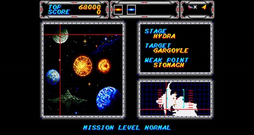 Como seria de esperar, este é também um jogo bastante exigente. Os inimigos vão tendo padrões de movimento distintos e temos também um daqueles níveis chatos em cavernas onde teremos de não só escolher o caminho certo para prosseguir, mas o próprio cenário também nos vai atacando, com paredes que se movem e outros obstáculos. E claro, ao mínimo de dano sofrido pela nossa nave perdemos uma vida. Cada vez que percamos uma vida perdemos também os satélites que tenhamos eventualmente coleccionado e mediante a dificuldade escolhida, perdemos também pelo menos a arma que tenhamos actualmente equipada. Isto na dificuldade normal, nas dificuldades superiores perdemos ainda as restantes armas e power ups coleccionados também, pelo que recuperar um poder de fogo decente ainda nos vai dar algum trabalho e tornar os bosses mais complicados.