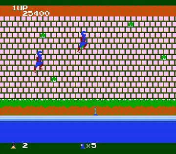 No que diz respeito aos controlos, estes até que são bastante simples na sua essência. O direccional serve para movimentar o Kage pelos cenários, sendo que o botão de cima serve para saltar. Para além disso, depois de saltar não podemos mudar a nossa trajectória, pelo que temos de ser algo cuidadosos quanto o fizermos. Os botões faciais servem para atirar shurikens (cujas têm munições ilimitadas mas apenas podemos ter duas shurikens nossas a atravessar o ecrã de cada vez) e o outro para usar a nossa pequena espada. Apesar do seu curto alcance, a espada serve também para deflectir as shurikens inimigas, algo que nos dará muito jeito, pois como certamente se irão aperceber, os inimigos surgem no ecrã continuamente e de todas as direcções. Não conseguimos no entanto deflectir o ataque dos inimigos que cospem fogo, esses são ameaças que devem ser derrotadas o quanto antes!