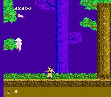 Neste jogo nós controlamos um ninja (Kage) e a história segue o cliché do costume: a princesa Kiri foi raptada e nós teremos de atravessar uma floresta, escalar as muralhas de um castelo inimigo e infiltrá-lo para salvar a princesa. Só isso. Mas como muitos jogos arcade da época (tipo… Ghosts ‘n Goblins) teremos de repetir o processo pelo menos uma vez. No caso desta versão Famicom/NES teremos de a salvar três vezes ao todo, com os cenários a mudarem a sua paleta de cores de verão, outono e inverno em cada fase.