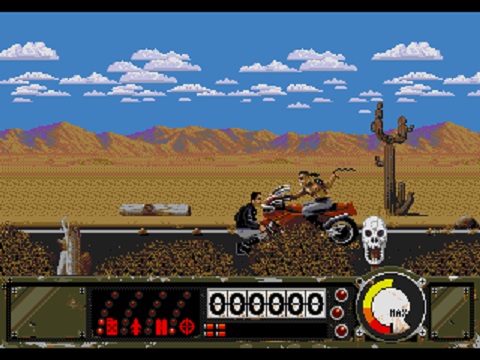 Para além disso existem vários outros aspectos que não resultaram muito bem, particularmente na versão Mega Drive e esses assentam-se nos seus controlos. Quando conduzimos os botões A e B servem para travar e acelerar, enquanto o botão C serve para disparar. Lembram-se quando eu referi acima que ocasionalmente o jogo mostra-nos uma vista lateral num pequeno quadrado do ecrã onde temos uma shotgun apontada numa das janelas do carro? Bom, continuamos a ter de manobrar o carro, pelo que não deixamos de ver a estrada à nossa frente e como temos apenas um botão de disparo, o jogo é que decide se vamos disparar com a metralhadora frontal ou com a shotgun. E muitas vezes essa vista lateral é activada sem qualquer sentido, fazendo-nos desperdiçar recursos desnecessariamente. Mas aí pronto, a Mindscape pouco poderia fazer tendo em conta os poucos botões que o comando regular da Mega Drive possui, já a versão SNES é um pouco diferente nesse aspecto, como irei apresentar brevemente. Para disparar os mísseis temos de pressionar os 3 botões faciais do comando da Mega Drive em simultâneo. Quando andamos a pé temos também um botão para saltar, outro para usar a shotgun e um outro para socos ou pontapés. Também aí as coisas não são famosas com os nossos disparos por vezes a não fazerem rigorosamente nada ao alvo…