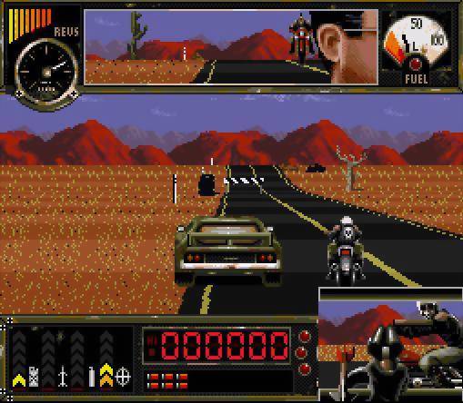 Ora a primeira diferença que é logo notória mal começamos o jogo é o facto de a versão SNES se jogar na terceira pessoa. Sinceramente não tem o mesmo impacto pois vemos as sprites dos veículos inimigos mais pequenas, com menos detalhe e sejamos sinceros, vermos em alta definição um punk a sair disparado por cima do nosso carro é algo muito satisfatório. Mas para compensar tem outros detalhes melhores: a informação relevante (combustível, munições, turbos, etc) está apresentada no ecrã de uma forma mais elegante, na parte de cima temos na mesma direito a um espelho retrovisor, agora bem maior e ainda com o reflexo do próprio condutor e que até tem alguns detalhes gráficos interessantes, como o facto de a sua cara se virar para a esquerda ou direita caso disparemos a nossa shotgun nessas direcções.