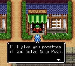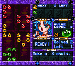 O jogo possui vários modos de jogo distintos. A começar pelo Arle’s Roux, um modo história com a Arle como principal protagonista. Aparentemente este modo de jogo é um remake de um dos Nazo Puyos da Game Gear também! Basicamente Arle lembra-se de fazer um caril e parte então à aventura em busca dos ingredientes necessários. Poderemos depois navegar por uma série de áreas e falar com diversas personagens, que nos desafiam a resolver uns quantos puzzles antes de nos entregarem algum ingrediente. Tal como referi acima, nestes desafios o ecrã já está previamente preenchido com vários Puyos e temos também a indicação de quais serão os próximos Puyos a cair do ecrã. Em baixo temos o objectivo a cumprir, que pode ser tão simples como limpar todos os Puyos do ecrã, limpar apenas os Puyos de uma cor, limpar apenas um número específico de Puyos, conseguir fazer umas quantas chains (combos) ou limpar um certo número de Puyos em simultâneo. Os puzzles começam bastante simples, mas à medida que vamos avançando vão ficando cada vez mais complexos e os objectivos são bastante rígidos e devem ser cumpridos à risca. Por exemplo, se o desafio for fazer uma chain de 3 e fizermos uma de quatro, falhamos o puzzle. Temos também um número limitado de tentativas e depois é game over, pelo que os save states foram uma ajuda preciosa!