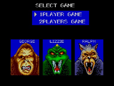 Apesar de termos os mesmos três monstros à disposição (um gorila, lobisomem ou réptil, todos gigantes), ao contrário da versão arcade, como seria de esperar, esta versão suporta um máximo de dois jogadores apenas. Os monstros não têm diferenças entre si, pelo que a nossa escolha é algo irrelevante, para o resto do jogo. Na verdade, o manual diz que o gorila é melhor a escalar edifícios, enquanto o réptil é mais rápido como um todo, mas na verdade a existirem são diferenças mínimas. Ao longo do jogo teremos todo um conjunto de cidades norte-americanas para destruir, cada uma com 5 níveis distintos, onde o objectivo é o de destruir todos os prédios. Claro que desde cedo começamos a ser atacados por militares, desde soldados que nos atacam das janelas dos edifícios, passando por helicópteros ou outros veículos como tanques que também nos vão atacando.