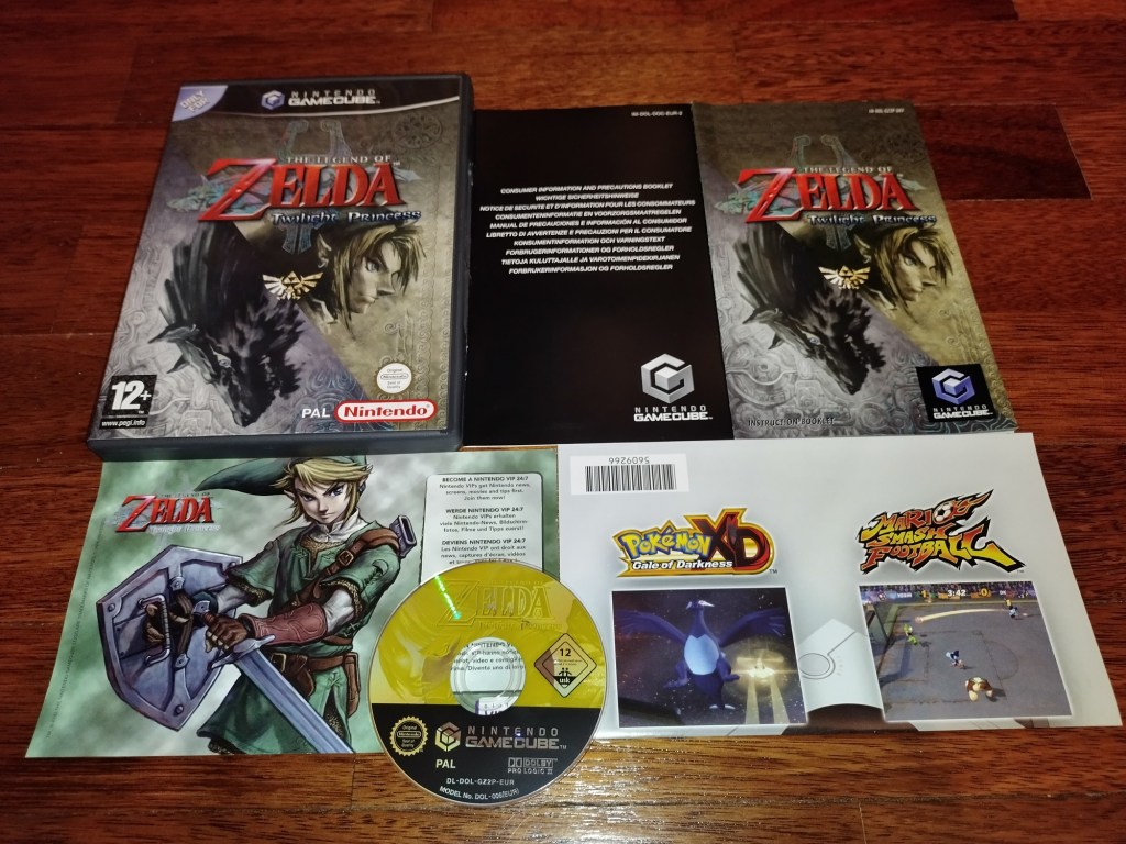 Lembro-me bem da E3 de 2004 pois estava a acompanhar a conferência da Nintendo num cyber café perto da minha escola secundária. Foi a primeira aparição de Reggie Fils-Aime enquanto manda chuva da Nintendo of America, jogos como Metroid Prime 2 e Resident Evil 4 a ganharem destaque, a Nintendo DS é oficialmente apresentada e no fim… no fim vemos um pequeno trailer que mostra um mundo de fantasia medieval algo sinistro… e um Link adulto e “realista”. Foi o caos na audiência e eu também dei um berro no cyber café! O que a Nintendo havia anunciado foi mesmo este The Legend of Zelda Twilight Princess, que acabou por ser lançado apenas em 2006 para coincidir também com o lançamento da Nintendo Wii. Apesar da versão da Wii ser a mais popular, sempre apreciei o facto de a Nintendo ter assegurado que mantinha o lançamento original da GameCube, mesmo que esse sistema já estivesse mais que moribundo em 2006. No entanto essa versão não chegou a ser oficialmente comercializada em Portugal, mas isso já foi decisão da Concentra. O meu exemplar foi comprado ainda em 2006 no saudoso miau.pt, a um vendedor que já me tinha vendido uns quantos jogos de GameCube. Custou-me 40€. Entretanto, anos mais tarde a Nintendo lança uma versão remasterizada em HD deste jogo para a WiiU, que acabou por vir parar à colecção através de um amigo meu, algures por 2018, a um preço bem convidativo que sinceramente já não me recordo. Eu terminei o Twilight Princess ainda em 2006 na GameCube, na altura em que o comprei. Comecei este blogue anos mais tarde e sempre quis jogá-lo novamente para que depois pudesse escrever um artigo em que a memória do jogo estivesse mais fresca, mas isso acabou por não acontecer. Aproveitei no entanto este remaster da WiiU para o jogar novamente mas agora nessa plataforma, pelo que aproveitarei este artigo para referir algumas das diferenças entre as versões existentes.