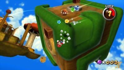 Há muito a dizer da jogabilidade deste Mario Galaxy, mas vamos começar pelos seus controlos. Eu não sou o maior fã do wiimote, mas tendo em conta que este jogo foi criado exclusivamente a pensar num wiimote e nun-chuck (até ao recente relançamento na Switch não tínhamos forma de o jogar com um esquema de controlo mais tradicional), convém então dar-lhe o devido destaque. O analógico do nun-chuck serve então para controlar o Mario pelo ecrã e o resto do jogo é controlado primariamente com os botões A (saltar), B (disparar star bits acumulados) e Z, que pode ser usado em conjunto com outros botões para acções diversas como aquele salto onde a meio do mesmo podemos cair com força no chão, efectuar saltos longos para a frente, ou saltos mais altos com um mortal para trás. Usando o botão A com os timings certos permite-nos também efectuar os mesmos 3 saltos diferentes que já poderíamos fazer com o Mario 64, por exemplo. Mas e os controlos de movimento? Bom, esses são utilizados primariamente em duas coisas distintas. O wiimote serve, entre outras coisas, como um apontador com um cursor no ecrã. Ao mover esse cursor poderemos apanhar os vários star bits espalhados ao longo dos níveis que poderão posteriormente não só servirem para desbloquear novos níveis, mas com o botão B podem também ser disparados para o local apontado pelo wiimote. Por exemplo, podemos atordoar temporariamente certos inimigos se lhes dispararmos com star bits de forma certeira. De resto podemos também abanar o wiimote e, dependendo do contexto, poderá resultar em diferentes acções. A mais comum é fazer o Mario rodopiar sobre si mesmo, o que poderá também ser uma maneira de atacar os inimigos ou até de extender um pouco o nosso salto. Viajar entre micro-planetas também nos obriga a abanar o wiimote em certos pontos, assim como em alguns power ups que possamos apanhar. Por exemplo, na forma de “Super Mario”, abanando o wiimote faz com que disparemos as bolas de fogo. Aliás, há aqui toda uma série de novos power ups a ter em conta, como um Super Mario que dispara bolas de gelo, a possibilidade de nos transformarmos numa abelha que nos permite voar temporariamente e agarrarmo-nos a certas superfícies, transformarmo-nos num Boo e assim atravessar certas paredes, entre outros.