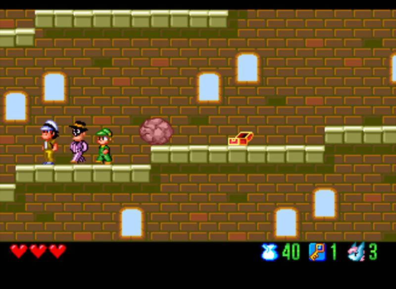 Uma vez começando um dos níveis vemos que a jogabilidade está longe de ser a tradicional de um jogo de plataformas. Acima referi que o personagem principal era o jovem Kakeru, acompanhado de 4 amigos. Pois bem, desses 4 amigos, em cada nível teremos dois que nos seguirão para todo o lado e repetem todos os nossos movimentos. Kakeru é o líder, mas a qualquer momento poderemos alternar entre os restantes, cada qual com diferentes ataques e capacidades de salto. Por exemplo, o marinheiro tem um ataque capaz de atirar projécteis em arco que é bastante útil em certas ocasiões, por outro lado os seus saltos são péssimos. Já a menina é a que mais e melhor salta, mas não consegue atacar! A personagem líder é a única capaz de sofrer dano, mas outra curiosidade é que apesar de todos eles possuírem diferentes características, todos acabam por absorver as características da personagem líder, herdando os seus ataques e agilidade. É um sistema de jogo interessante mas sinceramente acaba por ser algo subaproveitado pois Kakeru serve perfeitamente na maioria do tempo.