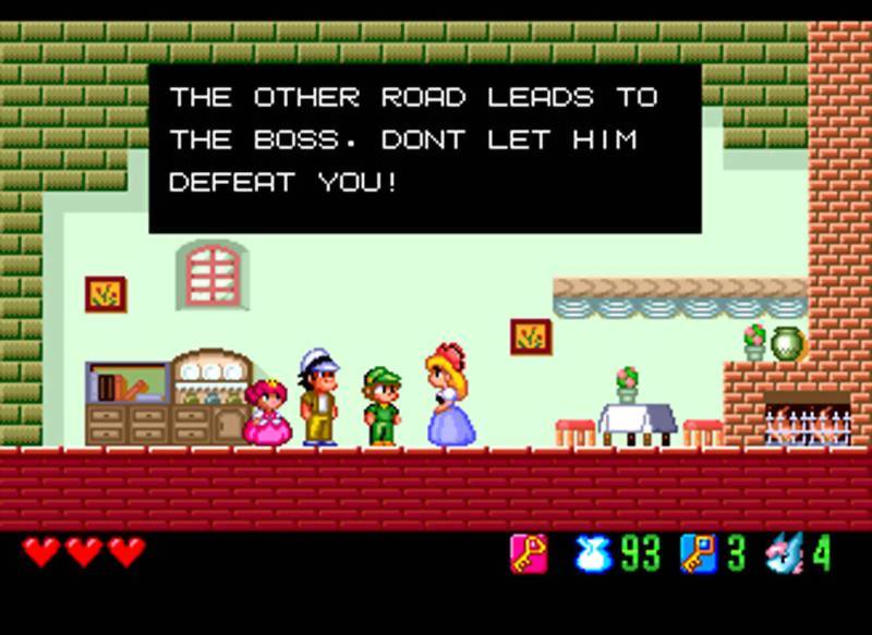 Bom e como funciona mesmo este jogo? Inicialmente temos um mapa onde poderemos explorar vários níveis à lá Super Mario Bros 3 e para passarmos ao “mundo” seguinte teremos de derrotar o boss desse mundo. Para isso precisamos no entanto de encontrar uma chave vermelha, que poderá estar em qualquer um dos níveis anteriores. Muitas vezes no final de cada um desses níveis (que por sua vez até poderão ter saídas alternativas) vamos encontrando alguns NPCs que nos vão dando algumas dicas, umas úteis, outras algo irrelevantes, mas ocasionalmente lá nos dizem onde está a tal chave vermelha. Quer isto dizer que se conhecermos bem o jogo não precisaremos de explorar todos os níveis para chegar ao seu final, se bem que muitos dos seus itens secretos, incluindo as chaves, obrigam-nos a disparar em lugares vazios na esperança que os mesmos surjam, algo que não é assim tão incomum em certos jogos da Hudson ou mesmo nalguns Wonder Boy da Westone.