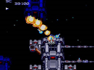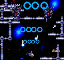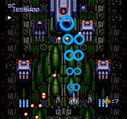 E este é então um frenético shmup vertical onde sozinhos teremos de lutar contra todo um exército de forças invasoras. Os controlos são simples, o d-pad serve para movimentar a nave, o select para definir a agilidade com que nos podemos mover e o botão II para disparar. O botão I tem uma função específica que já irei detalhar em seguida. Como sempre nós começamos o jogo com um poder de fogo muito limitado, mas rapidamente teremos acesso a uma série de itens e power ups coloridos que nos darão diferentes armas. A saber, os itens vermelhos melhoram a vulcan com a qual começamos, permitindo-nos disparar até 5 direcções distintas. As esferas azuis por sua vez mudam-nos a arma para um conjunto de círculos que dispersam e aumentam de tamanho com a distância, permitindo-nos assim alcançar uma área de fogo maior. Os verdes activam uns raios laser que no seu upgrade máximo permitem-nos dispara 3 lasers em simultâneo, todos eles capazes de atravessar os inimigos que atingem. Os amarelos são um lança-chamas que apesar de ser a arma mais poderosa do nosso arsenal, é também a que representa um maior risco devido ao seu curto alcance.