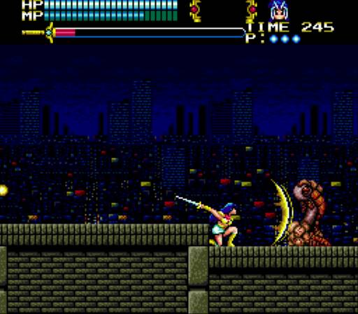 No entanto, apesar da espada de Yuko disparar projécteis, ao contrário dos Valis anteriores não podemos evoluir/trocar o tipo de projécteis lançados. Abaixo das barras de vida e magia vemos uma outra barra de energia na forma de uma espada que se vai enchendo com o tempo e esvaziando sempre que atacamos. Tal como em jogos como o The Legendary Axe, os nossos ataques dão mais dano quando essa barra de energia está no máximo e menos quando a mesma estiver ainda a ser preenchida. Existem no entanto alguns power ups que podemos apanhar e podem expandir essa barra de energia (com os ataques causando mais dano quando a energia estiver no máximo) e outros que façam com que essa barra se encha mais rápido. Mas existem sim algumas variedades nos ataques que poderemos desencadear, bastanto para isso trocar de personagens. Cham ataca com um chicote à lá Simon Belmont e Valna usa uma arma mágica que dispara projécteis em várias direcções. Todos eles partilham a mesma barra de vida e magia no entanto e sempre que alguém morre lá se vão todos os power ups amealhados. Num jogo sem continues como é o caso, obriga-nos a jogar então de forma mais cautelosa. De resto só mesmo mencionar que nem sempre podemos alternar entre personagens escolhidas. No canto superior direito vemos uma série de caras, que correspondem às personagens que podemos controlar. A cara que está voltada para nós é a personagem que controlamos no momento, enquanto as caras de perfil significam que podermos alternar para essas personagens. Existem no entanto níveis ou outras alturas onde teremos de jogar com alguma personagem específica, com os retratos das personagens restantes a ficarem de costas para nós.