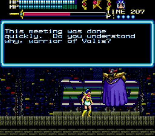 A nível audiovisual confesso então que fiquei impressionado por este jogo, que sai us valentes meses antes do remake do primeiro Valis, possuir gráficos melhores! Os cenários são mais interessantes e variados a meu ver, mas para além disso também me pareceram mais bem detalhados que os do remake do primeiro Valis. As sprites, particularmente as dos inimigos e bosses, são também mais bem detalhadas que as do remake do primeiro jogo! As cut-scenes anime que vão ocorrendo ocasionalmente estão muito boas para um cartucho de Mega Drive com 1MB de ROM. Para além de estarem tão bem detalhadas quanto as do remake, ainda vão tendo algumas pequenas animações aqui e ali que lhes dão um aspecto ainda melhor! Para além disso, mesmo durante o jogo ocasionalmente vamos tendo alguns diálogos com NPCs que também ajudam bastante à boa apresentação do jogo. A banda sonora é no entanto bastante agradável, tirando bom partido das capacidades do chip de som da Mega Drive para produzir melodias chiptune agradáveis e que ficam bem no ouvido.No entanto, o lançamento original deste Valis III foi para a PC Engine CD, que por sua vez trazia cut-scenes bem mais animadas e em maior número, voice acting, uma banda sonora em CD audio e vários níveis que foram cortados nesta versão. A Mega Drive possui no entanto alguns efeitos de parallax scrolling em vários níveis bem como um nível extra não presente na versão original.