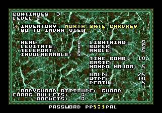 E este é um jogo de acção interessante onde através de uma série de níveis deveremos cumprir vários objectivos, desde o de eliminar todos os inimigos presentes, passando por coleccionar uma série de chaves ou destruir vários objectos-chave como geradores, por exemplo. Ronaan terá todo um arsenal de diferentes feitiços à sua disposição e as mecânicas de jogo têm o que se lhe diga. Devo começar então por avisar que este é um título que suporta os comandos de 6 botões da Mega Drive e deveremos mesmo utilizá-los caso os tenhamos para facilitar um pouco mais os controlos. O botão A serve para atacar fisicamente com o bastão mágico que dispomos, enquanto que o botão B serve para disparar o feitiço ofensivo actualmente equipado. O C serve para equipar um outro feitiço ofensivo, onde para isso deveremos manter o botão C pressionado, que nos abre, no canto inferior esquerdo do ecrã, uma matriz de 3×3 com as iniciais de todos os feitiços que dispomos no momento, devendo seleccionar o novo feitiço com o direccional e só depois largar o botão C. Para além de feitiços ofensivos, teremos também acesso a feitiços de suporte como curar, levitar, teletransportar para a base (início do nível) ou temporariamente invencível. Num comando de 6 botões, esses feitiços ficam automaticamente mapeados para os botões mode, X, Y e Z, já num comando de 3 botões teremos de utilizar várias combinações de botões para os activar. Pressionar start leva-nos a um menu de pausa onde também poderemos fazer todas estas acções.