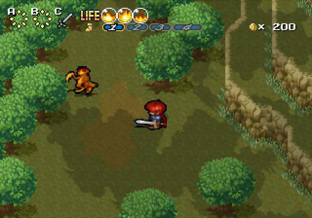 Então e o B? O B é usado para aumentar a nossa velocidade. Por defeito Mars caminha muito lentamente, então a Camelot achou boa ideia implementar esta mecânica onde teremos de pressionar o botão B várias vezes para que Mars se torne mais ágil (vemos a velocidade actual mesmo abaixo da nossa barra de vida) e uma vez com a velocidade desejada, teremos de manter o botão B constantemente pressionado para manter essa velocidade de cruzeiro. O problema? Basta sofrer dano para perdermos a velocidade que tínhamos e tendo em conta que os inimigos são bastante numerosos e a nossa espada tem um alcance ridiculamente curto, isto vai acontecer várias vezes. O Mars até pode dar encontrões nos inimigos para os matar e isso é uma técnica que aprendemos logo no início de jogo, mas tal também faz com que soframos dano, para além da habitual perda de velocidade. Os botões X, Y e Z têm também a mesma função do botão B. Ora este esquema da velocidade é então uma grande dor de cabeça e para além disso, termos todos os outros botões por usar é um crime. Por exemplo, ter de alternar constantemente entre a espada e um outro item que pode não ter propriedades de combate é uma chatice!