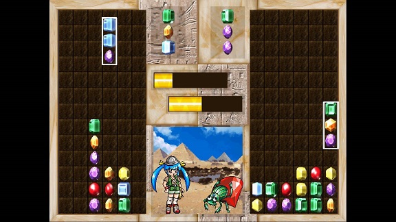 Seguindo os jogos pela ordem alfabética, até porque é dessa forma que os mesmos estão listados, ficamos então primeiro com o Columns. Sim, infelizmente o Alien Syndrome não está incluído na versão Europeia por algum motivo. Mas pronto, voltado ao Columns, este foi lançado originalmente no Japão como sendo o volume 7 da colecção Sega Ages 2500. Não há muito que enganar aqui, sinceramente, o Columns é um jogo de puzzle super simples (ainda muito recentemente escrevi sobre a sua versão PC Engine), pelo que aqui dispomos de 3 modos de jogo distintos: o Endless, versus CPU (modo história) e um versus para dois jogadores. Nos versus ocasionalmente vamos recebendo algumas peças especiais que, mediante a peça que toca na superfície, podemos fazer com que todas as peças iguais à que é tocada desapareçam da nossa área de jogo, diminuir a área de jogo do inimigo, ou recuperar parte da nossa área de jogo também. Perde quem tiver peças que ultrapassem a área de jogo! A nível audiovisual este Columns por si só já seria um jogo simples mas confesso que não achei que pudesse ser tão genérico como o resultado final. A temática deste Columns é o antigo Egipto, as colunas são modelos em 3D poligonal super básico, as cut-scenes e personagens do modo história são também muito simples e a música não é nada de especial. O modo endless pode ser jogado com os gráficos novos, ou com os do lançamento original de arcade.