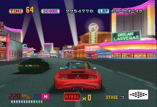 Segue-se portanto uma conversão do Out Run, essa obra prima de Yu Suzuki que também recebeu um remake budget inteiramente em 3D. E depois do Golden Axe e Monaco GP estava bastante receoso por jogar esta versão, mas na verdade até nem se saíram nada mal. Quem pegou nesta conversão foi novamente a SIMS e aqui dispomos de vários modos de jogo, desde o modo arcade (idêntico ao original a nível de conteúdo), o Arrange (novo conteúdo) e o time attack que nos coloca sozinhos a competir contra o relógio, seja nos circuitos do modo arcade ou arrange. Não me vou alongar no modo original onde, tirando os novos gráficos, tudo se mantém igual. Na verdade até podemos alternar entre a versão arcade internacional e a japonesa, cuja ordem dos “níveis” é diferente, o que achei um apontamento interessante. O modo arrange mantém a mesma jogabilidade do original, onde os botões faciais servem para acelerar ou travar e os L1/R1 para alternar entre as mudanças baixas ou altas. No entanto possui alguns segmentos com cenários inteiramente novos como é o caso de atravessarmos a cidade de Las Vegas repleta de neons. Aqui teremos também a possibilidade de escolhermos caminhos alternativos, embora estes no fim acabem por se afunilarem num único caminho final até à meta. Neste modo arrange teremos também alguns carros rivais que podemos tentar ultrapassar e por cada carro desses que tenhamos ultrapassado recebemos uma boa quantidade de pontos extra assim que atravessarmos a meta.