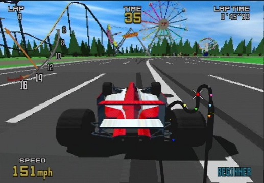 Segue-se por fim o Virtua Racing, mais um clássico de Yu Suzuki aqui presente nesta compilação. O seu lançamento original foi o primeiro jogo do sistema Model 1, desenvolvido pela Sega em cooperação com a empresa de aviação Lockheed Martin. Os jogos desenvolvidos para este sistema eram em 3D poligonal algo primitivo e sem quaisquer texturas, mas a sensação de velocidade e fluidez introduzidas pelo Virtua Racing eram algo sem precedentes na indústria. E aqui dispomos de vários modos de jogo, a começar pelo arcade que é uma representação do original com 3 circuitos e o objectivo de chegar em primeiro lugar dentro do tempo limite. Infelizmente o jogo não traz os carros ou circuitos extra da versão 32X (não contava com os da Saturn visto que essa conversão foi feita por terceiros), mas existem no entanto outros carros e circuitos que poderão ser usados nos restantes modos de jogo. O primeiro é o modo Grand Prix, que nos obriga a competir em 5 conjuntos de 6 pistas, as 3 originais e 3 novas, onde o objectivo é o de ter mais pontos no final de cada mini-campeonato. Os pontos que vamos amealhando neste modo vão-nos permitir desbloquear também os novos carros. O Free mode permite-nos fazer corridas livres em qualquer circuito e com qualquer carro que tenhamos desbloqueado e o 2P mode é um versus para dois jogadores, tal como o seu nome indica. De resto, a nível visual este é um jogo naturalmente mais bonito que o original devido aos modelos poligonais serem mais complexos e os cenários como um todo terem mais detalhe, mantendo no entanto a identidade do original e a fluidez está lá na mesma, o que é bom. Tal como o original no entanto o jogo não tem músicas, existindo apenas pequenas melodias nos menus ou durante certos acontecimentos nas corridas, como atravessar um checkpoint. Os efeitos sonoros infelizmente são horríveis e são a única coisa que realmente mancha esta versão. Ainda assim, de todos os jogos presentes nesta compilação, este Virtua Racing parece-me o mais bem conseguido.