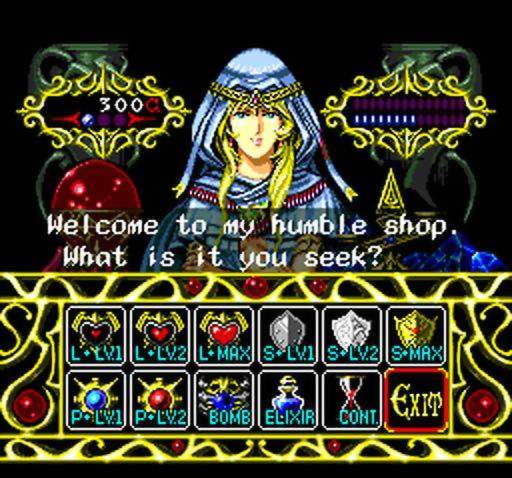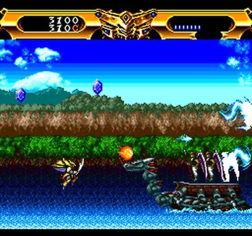Como é normal neste tipo de jogos, à medida que vamos jogando podemos também apanhar toda uma série de power ups ao destruir inimigos. Os mais comuns são cristais coloridos que servem de unidade monetária. Isto porque antes de começar cada nível, para além de escolher a armadura a equipar, somos também levados para uma loja onde poderemos utilizar esses créditos para comprar itens adicionais desde escudos que nos protejam de dano, bombas extra, continues ou regenerar as nossas barras de vida e “poder”. Se bem que estes últimos são também itens que podem surgir normalmente durante o jogo e convém também referir que quanto maior a nossa barra de poder, mais poderosos serão os nossos ataques! Isto torna as armaduras de água e fogo especialmente poderosas, na minha opinião. Por exemplo, a de água é a única que nos permite disparar em simultâneo para a esquerda e direita!