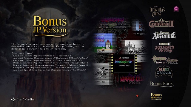 Uma das melhores características desta compilação é a inclusão das versões japonesas dos jogos aqui presentes, visto que muitas das versões ocidentais possuem alguma censura. E o Castlevania III com aquela banda sonora faz uma grande diferença!