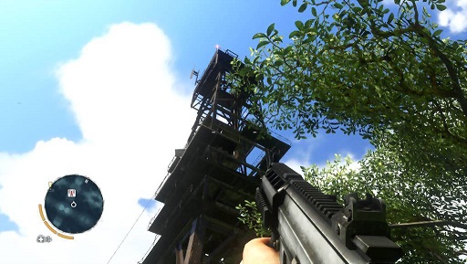 Este é um jogo open world onde, tal como no Assassin’s Creed, escalar certos pontos altos como estas torres de radio permitem-nos “sincronizar” o mapa e revelar os seus detalhes.