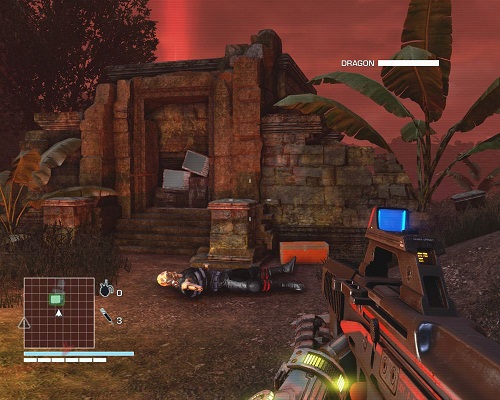 Existe também um sistema de skills, mas este é bem mais contido e não temos qualquer hipótese de customização, pois estas vão-nos sendo atribuídas automaticamente sempre que subirmos de nível. De resto, tal como nos outros Far Cry, temos também toda uma série de coleccionáveis para apanhar caso estejamos interessados em fazê-lo, como é o caso de cassetes de VHS ou televisões CRT, tudo isto acompanhado por diálogos sarcásticos do tipo “espero que a seguir não me peçam para apanhar penas ou bandeiras”. Este humor sarcástico é algo que nos acompanha ao longo de todo o jogo: Rex irrita-se com todo o tutorial, que começa de forma brilhante como “carrega em enter para mostrar que sabes ler”, um headshot é frequentemente acompanhado por frases como “now that’s how you play head games” ou “he was… open minded“, enquanto que se matamos alguém com o arco e flecha podemos ouvir “I really stuck it to him” ou “I think he got the point“. Em suma, todo este sarcasmo é algo que eu adoro e foi das melhores coisas que este Far Cry 3 Blood Dragon nos trouxe.