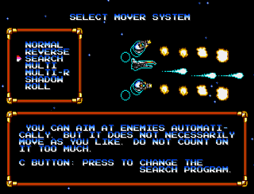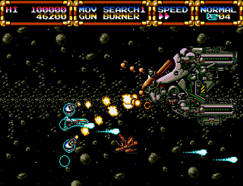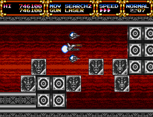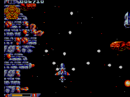 No fim de cada nível temos um boss e logo a seguir visitamos uma loja onde poderemos comprar toda uma série de itens e power ups, com dinheiro amealhado ao destruir inimigos. Itens como autofire, melhorar o nosso poder de fogo, a agilidade da nossa nave ou recuperar a barra de vida são alguns dos exemplos, embora muitos destes possam também serem encontrados ao longo dos níveis. Outros itens como armas secundárias ou satélites que disparam ao nosso lado podem também ser comprados e muitas dessas armas adicionais até podem ser equipadas em conjunto, o que aumenta drasticamente o nosso poder de fogo. Qual o problema? Esta versão da Master System é bastante lenta, a consola não aguenta com tanto projéctil e/ou inimigo no ecrã em simultâneo. O que poderia ajudar num jogo deste tipo, mas neste caso a lentidão é mesmo constante e quando há muita coisa a acontecer no ecrã poderemos deixar de ver alguns dos nossos projécteis ou mesmo inimigos!