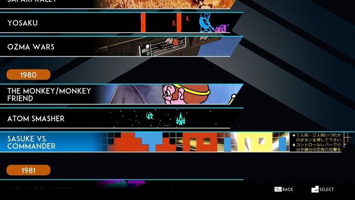 Em seguida voltamos ao ano de 1980 para o Sasuke vs Commander. Como devem calcular, este é um jogo bastante primitivo e eu diria que algo influenciado por títulos como Space Invaders ou Galaxian. Mas em vez de lutarmos contra naves inimigas, atacamos ninjas que se atiram do alto do ecrã na nossa direcção e também nos teremos de desviar dos seus projécteis. No final do nível somos levados para um nível de bónus onde teremos um inimigo mais poderoso para enfrentar dentro de um tempo limite. Se o conseguirmos derrotar, óptimo, caso contrário apenas não recebemos pontos extra e seguimos para o nível seguinte, onde todo este processo se repete, com a dificuldade a tornar-se cada vez maior.