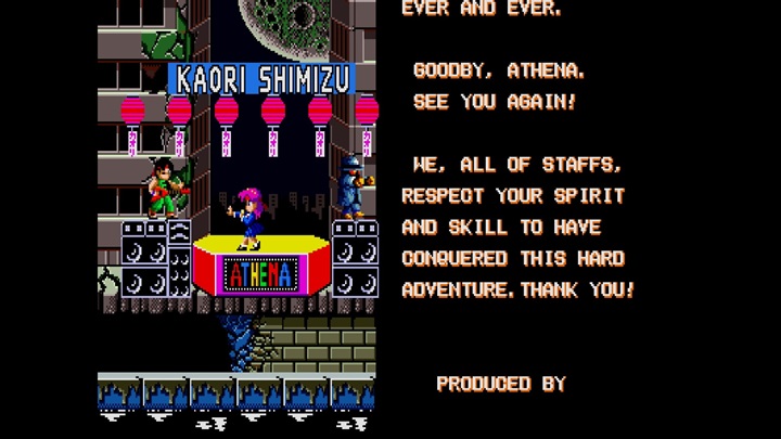 O Athena é um jogo de plataformas de 1986 onde controlamos uma princesa de mesmo nome. Começamos por jogar de bikini e apenas munidos de um pontapé, mas à medida que vamos explorando, derrotando inimigos e apanhar diversos power ups, poderemos equipar diferentes armas e armaduras que Athena passa a usar. Os níveis vão sendo variados, atravessando diferentes florestas, montanhas, cavernas ou até zonas subaquáticas onde Athena se transforma em sereia para melhor as atravessar. Não é um jogo do outro mundo, mas até que é um platformer interessante quanto mais não seja por oferecer alguma não linearidade na exploração, o que não era muito usual para a data. É bem melhor que a versão NES que está aqui também incluída, embora essa seja uma versão que gostaria um dia destes de arranjar para a colecção.