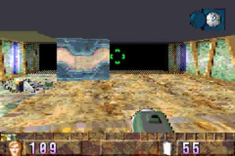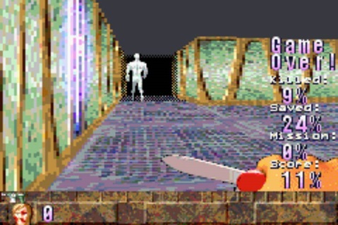 Quais são então os problemas deste jogo? Bom, vamos começar pelo facto de os “níveis” serem extremamente grandes, labirínticos e muito similares entre si, o que nos levará a andar muito tempo perdidos a vaguear pelos mesmos. Outra coisa que não ajuda é o facto de termos várias passagens secretas tal como no Wolfenstein 3D e outros jogos similares, cujas são descobertas ao interagir com as paredes até as encontrarmos. O problema é que ao contrário de jogos como o Wolf3D, aqui teremos mesmo forçosamente de encontrar algumas dessas passagens para conseguir progredir no jogo, o que aliado à natureza labiríntica dos níveis torna a coisa ainda mais chata. Jogando em emulação temos a vantagem de perceber que essas paredes especiais possuem uma ligeira degradação na cor, mas duvido que tal seja tão facilmente perceptível num ecrã original do GBA.