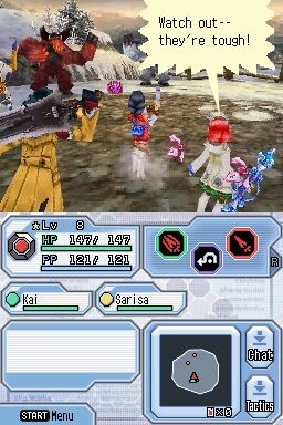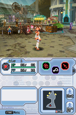 A nível de jogabilidade esta é muito, muito semelhante à do Phantasy Star Online e isso foi também a outra das razões que me levou a querer jogar este jogo novamente. Os controlos foram adaptados aos botões da Nintendo DS, mas não fogem muito de como se jogava PSO na Dreamcast. Os botões faciais A, B e Y podem ser mapeados com as mais variadas acções, sejam diferentes tipos de ataques físicos (que podem ser encadeados uns nos outros se pressionarmos os botões no timing certo), o uso de itens ou magias. Enquanto mantivermos o botão R pressionado temos acesso a uma outra paleta de 3 acções adicionais que poderão ser mapeadas para os mesmos botões faciais. O uso de mags (pequenos robots flutuantes que nos acompanham) marca aqui a sua presença uma vez mais: estes vão guardando energia à medida que vamos combatendo e uma vez no máximo essa energia pode ser libertada numa acção especial que poderá ter diferentes efeitos mediante a maneira como vamos evoluindo o nosso mag (que também irá mudar de aparência). O botão L serve para fazer reset à câmara ou para fazer lock-on nalgum inimigo ou objecto, caso surja algum cursor no ecrã.