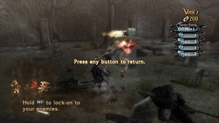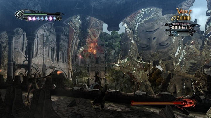 Já a nível de mecânicas, este é, tal como referi acima, um jogo de acção bastante over the top e frenético e que, tal como a série Devil May Cry, mistura o combate corpo-a-corpo com recurso a armas brancas e o de armas de fogo, possuindo uma grande variedade de diferentes combos possíveis, muitos deles bastante estilosos até, mediante as armas e acessórios que tenhamos equipado na altura. Um dos grandes focos está na mecânica de dodge onde, quando nos desviamos de algum golpe inimigo mesmo à última, entramos automaticamente e de forma temporária num modo de câmara lenta (witch time), onde os nossos golpes se tornam bastante mais poderosos. Se sofrermos dano enquanto estamos nesse estado, ele acaba por ser logo interrompido, no entanto. Portanto, como devem imaginar, esta é uma mecânica de jogo importante e que nos obrigará a estudar bem o movimento dos nossos inimigos para causar o máximo de dano possível, até porque a nossa performance vai sendo medida ao longo do jogo e os pontos extra que ganhamos em jogar bem serão igualmente importantes para comprar itens ou outros upgrades. De resto, para além da barra de vida, Bayonetta vai tendo também uma barra de magia, que pode ser utilizada para uma série de outras habilidades especiais, incluindo as técnicas de execução rápida de certos inimigos. No entanto, sempre que somos atingidos perdemos magia também. De resto convém também mencionar que o jogo possui também um simples sistema de crafting onde podemos criar itens que nos regeneram vida, magia, deixam-nos temporariamente mais fortes entre outros, se bem que o jogo nos penaliza na avaliação se os utilizarmos.