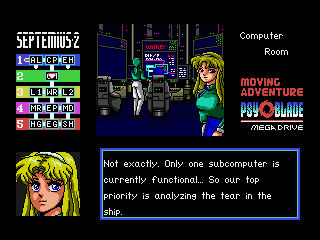 A nível audiovisual, Psy-O-Blade apresenta um nível de detalhe razoável para um título de 1990. Algumas escolhas criativas são curiosas, como o facto de três dos colegas de tripulação do protagonista serem negros, todos com as mesmas feições, cor de cabelo e uniformes idênticos, um contraste evidente em relação ao resto da tripulação. Sendo esta uma aventura gráfica, os cenários são bem detalhados, ainda que estáticos, e o jogo exibe um forte estilo anime. A banda sonora é algo eclética nos géneros musicais que aborda e tem alguns temas mais rock que me agradam bastante e tipicamente resultam sempre bem no chip de som da Mega Drive. Por fim uma nota em relação à tradução. Confesso que não sei o quão fiel a mesma está ao original, pois temos palavrões nos diálogos, o que não é assim tão usual em jogos de consolas desta época. Além disso, há certas escolhas peculiares, como termos um Robert e um Bob, uma personagem feminina chamada Feminine. A mais curiosa foi mesmo a referência ao filme Alien que me fez soltar uma ligeira gargalhada. Um diálogo algo do género “isto que se está a passar faz-me lembrar o filme Alien, que é um filme do século XX onde um alien infiltra-se numa nave e mata todos os tripulantes. Mas não te preocupes que a personagem feminina sobrevive”.