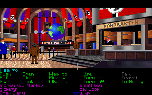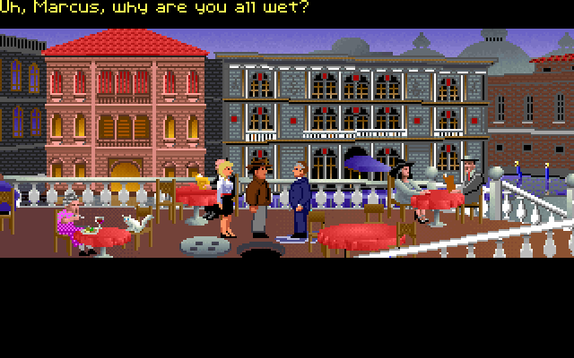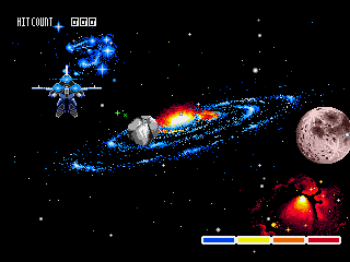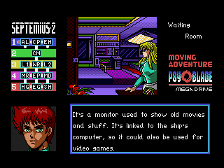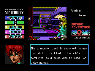 Em termos de mecânicas, Psy-O-Blade é uma aventura gráfica point and click. No entanto, enquanto esperava encontrar uma interface tradicional dos clássicos japoneses da época, como o Portopia, Famicom Detective Club ou Snatcher, com menus de texto representando acções, fui surpreendido por uma jogabilidade verdadeiramente point and click, com controlo total através de um cursor. O botão A serve para interagir com objectos, personagens ou elementos do cenário, enquanto o B permite cancelar acções ou avançar rapidamente o texto. Já o botão C abre um pequeno menu, normalmente utilizado para mudar de sala ou gravar o progresso do jogo. Nesta curta aventura, a progressão da história exige conversas frequentes com as mesmas personagens e uma boa dose de interacção com os cenários – o que significa, inevitavelmente, alguma caça ao pixel. O jogo é linear e bastante breve, como já referi, mas a narrativa tem os seus bons momentos e consegue manter o interesse. Há também um “jogo dentro do jogo”: a certa altura, somos forçados a jogar um clone de Space Harrier e alcançar pelo menos 200 pontos para avançar. Foi, de longe, a parte mais desafiante do jogo, mas uma surpresa agradável!
