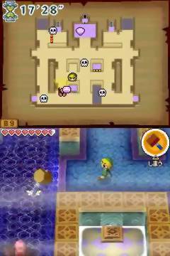 A grande particularidade de Phantom Hourglass é o sistema de controlo: tudo é feito através da stylus. O direccional e alguns botões servem apenas de atalhos, enquanto que movimentar Link ou atacar inimigos exige toques e arrastos no ecrã. Tal como noutros títulos da série, vamos coleccionando itens que nos conferem novas possibilidades: a pá para escavar, bombas, arco e flechas, entre outros. Apenas um pode estar activo de cada vez, e o seu uso depende de tocar em ícones no ecrã táctil. Percebo a intenção da Nintendo em tirar partido das funcionalidades da consola, mas senti falta de um esquema alternativo de controlos mais tradicionais. Combates contra alguns inimigos e bosses teriam beneficiado da precisão de um controlo clássico, e até a acção simples de rebolar nunca me saiu de forma satisfatória.