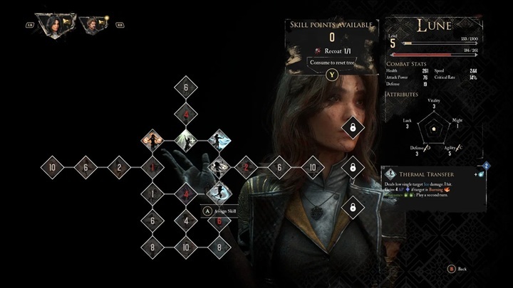 Por outro lado, cada personagem apresenta também dinâmicas e mecânicas de combate distintas, o que nos obriga a pensar em estratégias diferentes nos confrontos mais exigentes. No entanto, é mesmo nas armas e acessórios que o jogo ganha uma vertente estratégica ainda mais profunda. As armas possuem diferentes categorias e tipos de dano elemental, enquanto os acessórios, aqui apelidados de pictos, oferecem benefícios directos aos atributos das personagens quando equipados, assim como uma série de efeitos passivos, como ganhar mais ability points por acção, aumentar o dano infligido ou resistir a estados negativos como slow ou defenceless, entre muitas outras possibilidades. Algo que não entendi bem no início do jogo foi o facto de que, depois de equiparmos estes acessórios como pictos e os utilizarmos vezes suficientes em combate até os dominarmos, os seus efeitos passivos ficam disponíveis para serem equipados separadamente como luminas. Para isso é necessário aumentar os lumina points de cada personagem, algo que acontece naturalmente ao subir de nível, mas também através do uso de certos itens. Este sistema abre as portas a um nível de customização tão vasto que é possível, em certos casos, partir por completo o sistema de combate.