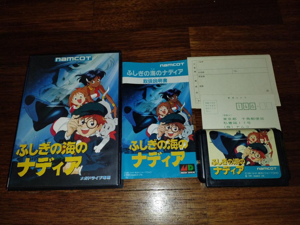 Tempo de voltar à Sega Mega Drive para um título muito curioso do seu catálogo, exclusivo do território japonês. Produzido pela Namco em 1991, este é um jogo baseado no anime de mesmo nome, conhecido no Ocidente por Nadia: The Secret of Blue Water. A série foi produzida pela Gainax, o mesmo estúdio que mais tarde nos trouxe o aclamado Neon Genesis Evangelion, e, ainda na primeira metade dos anos 90, foram lançadas várias adaptações do anime para videojogos, todas elas bastante distintas entre si e desenvolvidas para diferentes plataformas. A Gainax esteve por detrás dos lançamentos para computadores japoneses, enquanto outras empresas, como foi o caso da Namco, ficaram responsáveis pelas versões para consolas. O meu exemplar foi comprado no início de 2024, na loja francesa Gameswave, durante uma campanha de Inverno que decorreu nessa altura. Custou-me cerca de 30€.