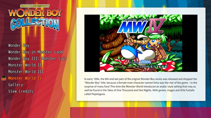 Esta é mais uma das parcerias entre a Strictly Limited Games e a ININ Games, que têm colaborado com bastante regularidade em lançamentos de cariz retro. Um comportamento recorrente nessa parceria é a forma como tratam certas compilações: existe uma edição “limitada” mais completa e uma edição de retalho mais modesta, 100% a cargo da ININ. A Wonder Boy Anniversary Collection foi anunciada em 2022 pela Strictly Limited, assumindo-se como a compilação “definitiva” da série clássica Wonder Boy, reunindo todos os jogos principais lançados nas décadas de 80 e 90, incluindo múltiplas variantes regionais e alguns extras adicionais. No mesmo ano, a ININ Games lançou em retalho uma outra compilação simplesmente intitulada Wonder Boy Collection. Enquanto o lançamento limitado inclui seis jogos com várias variantes, num total de 21 versões, o lançamento de retalho normal contém apenas quatro títulos: os dois jogos arcade, Wonder Boy in Monster World na sua versão Mega Drive e o fantástico Monster World IV. Sem variantes, sem grande parte dos extras. A discrepância é evidente e pode facilmente apanhar desprevenido quem não esteja atento.