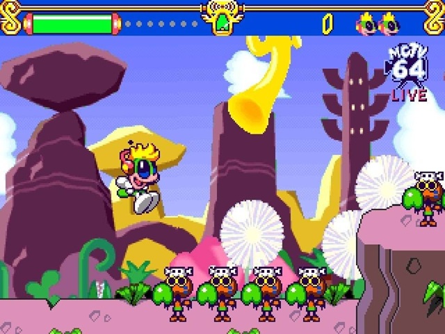 Esperam-nos portanto toda uma série de níveis de plataforma em 2D, com visuais muito bem detalhados, sprites bem animadas e muita coisa a acontecer em plano de fundo. No que toca aos controlos, o direccional move o Tempo e, se pressionarmos duas vezes seguidas na mesma direcção, começamos a correr. O botão A ataca com um pontapé e, se pressionado depois de correr, faz com que Tempo deslize pelo chão, causando dano a todos os inimigos em que toca, pelo menos enquanto o slide durar. O botão B salta, sendo que saltar em cima dos inimigos também lhes causa dano, e o C faz com que disparemos notas musicais, paralisando temporariamente os inimigos, ou até destruindo alguns pequenos objectos. É também possível saltar entre paredes ao pressionar o botão A imediatamente antes de colidirmos com uma delas, assim como planar ligeiramente ao manter o botão de salto pressionado.