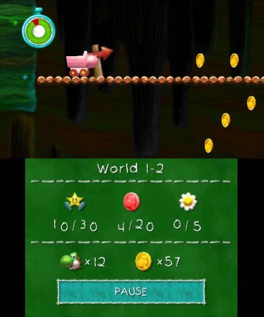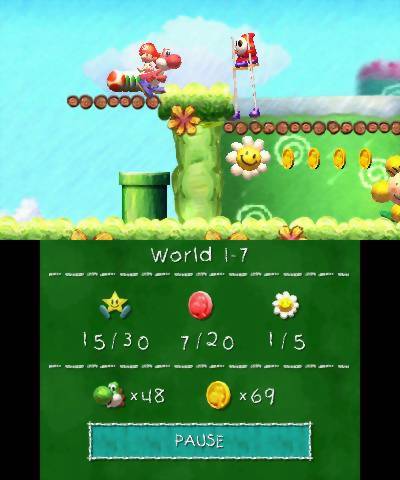 Tal como nos seus predecessores, os níveis oferecem bastante conteúdo para explorar, com passagens secundárias, segredos e diversos coleccionáveis. Estrelas, moedas vermelhas, flores sorridentes e medalhas douradas recompensam a exploração e, quando reunidos na totalidade, desbloqueiam níveis bónus, secretos ou especiais. Nestes últimos, Yoshi transforma-se em diferentes veículos, como carrinhos de mina, helicópteros, balões, submarinos, entre outros. É precisamente aqui que surge outra das principais novidades: o uso dos sensores de movimento da consola. Estes segmentos são controlados através da inclinação da Nintendo 3DS, algo de que, pessoalmente, não sou grande fã, já que nem sempre oferecem a melhor resposta. Outra diferença face ao seu predecessor directo da Nintendo DS prende-se com o uso dos ecrãs: apesar de a Nintendo 3DS possuir dois, apenas o ecrã superior é utilizado para a acção, enquanto o inferior serve para apresentar informação adicional, como o progresso nos coleccionáveis. Tal deve-se ao facto de apenas o ecrã superior permitir o uso do efeito 3D.