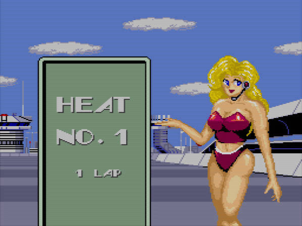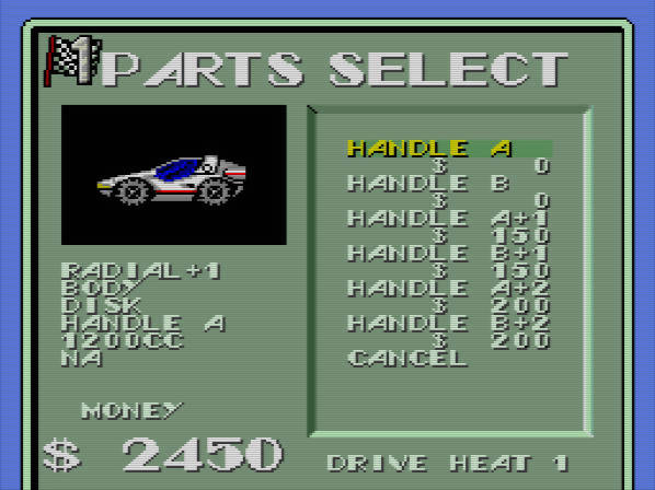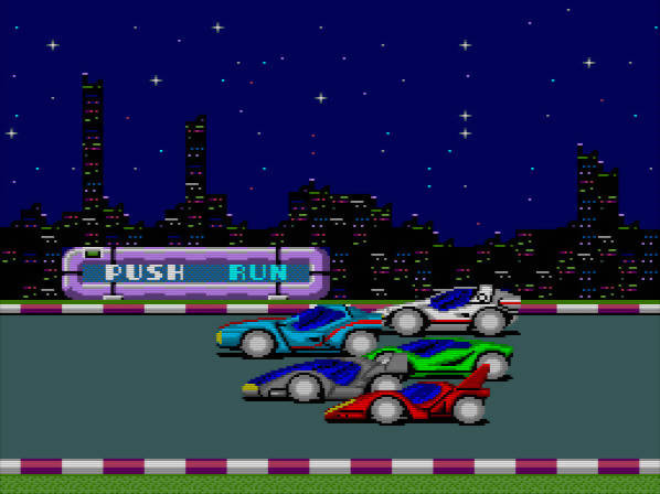 A menção ao combustível leva-me à outra grande particularidade de Moto Roader: o seu rubber banding, aqui aplicado de forma literal e bastante agressiva. Sempre que um carro fica demasiado para trás, prestes a sair do enquadramento da câmara, é automaticamente puxado para a frente, sensivelmente para o centro do ecrã. Isto aplica-se tanto ao jogador como aos adversários, resultando num comportamento algo bizarro e, por vezes, problemático. Por exemplo, se ficarmos para trás imediatamente antes de uma curva apertada, ao sermos reposicionados podemos surgir já em cima da curva, sem tempo de reacção, o que frequentemente resulta em despistes. O jogo insiste em reposicionar-nos até conseguirmos ganhar velocidade suficiente, mas cada uma dessas ocorrências implica uma penalização no combustível. E ficar sem combustível a meio de uma corrida resulta num Game Over. O reabastecimento é automático ao completar cada volta, existindo também algumas zonas específicas nas pistas, mas ainda assim, investir em tanques adicionais pode ser essencial para evitar fins prematuros.