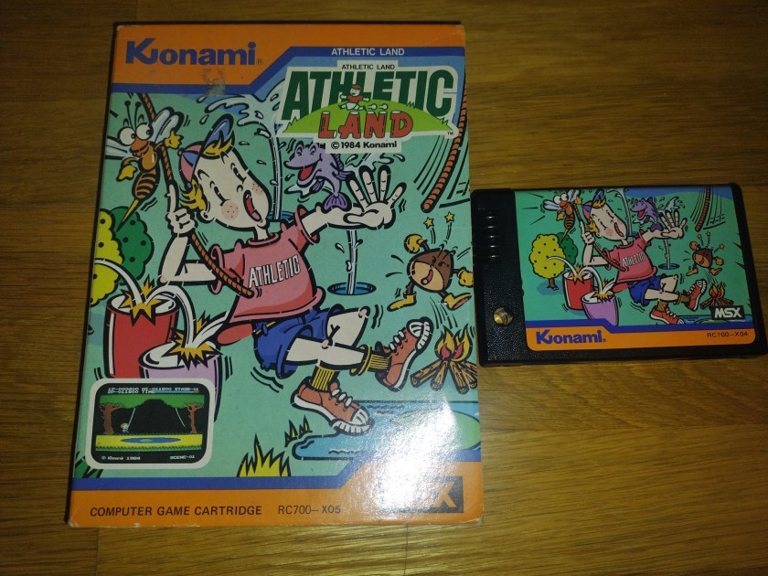 Continuando pelo MSX vamos ficar agora com um título da Konami, empresa que apostou bastante nesta plataforma particularmente durante a década de 80. Athletic Land é um jogo de plataformas que muito me faz lembrar o clássico PitFall da Activision, por todos os obstáculos que teremos de evitar e a precisão necessária no controlo dos saltos para o conseguir fazer. O meu exemplar foi comprado a um particular algures no passado mês de Março por 15€.