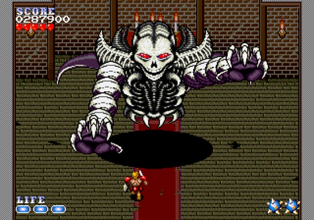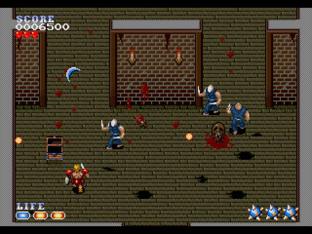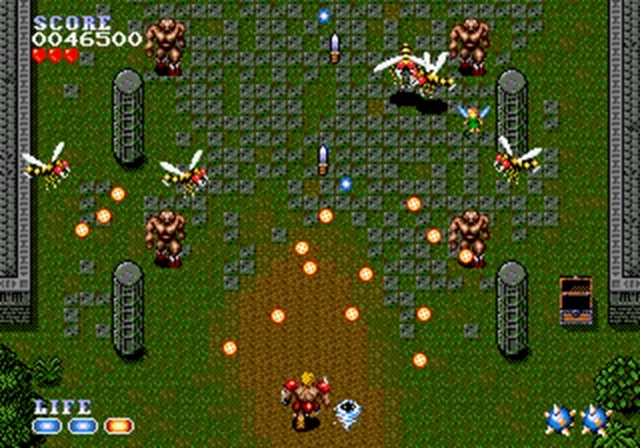 As mecânicas de jogo são simples na sua essência. O botão B serve para disparar (recomendo vivamente activar o rapid fire nas opções), o botão A activa o ataque especial, neste caso uma bola metálica com espinhos que orbita a personagem, oferecendo alguma protecção temporária contra dano inimigo. Já o botão C permite envergar o escudo, bloqueando ataques vindos da frente. Existe, no entanto, um trade-off importante, pois ao utilizar o escudo ficamos impossibilitados de atacar. Ainda assim, trata-se de uma habilidade preciosa quando usada de forma criteriosa, tal é o nível de desafio que o jogo apresenta.