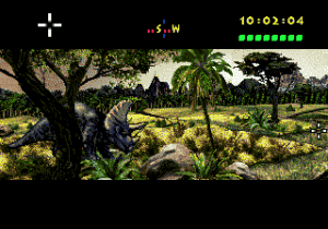 Passando para os audiovisuais, devo dizer que fiquei bem agradado com o que vi aqui. Este é um jogo na primeira pessoa, onde em cada ecrã onde estamos podemos olhar em 360º horizontalmente para as nossas imediações. Sempre que mudamos de área, temos uma pequena cutscene em full motion video a acompanhar essa transição, mas ao contrário da maioria dos jogos de Mega CD, aqui os vídeos são em maior resolução (embora a sua qualidade não seja a melhor de todas, como habitual). Uma vez terminada a transição, os cenários já são renderizados normalmente, embora tenham um bom nível de detalhe tendo em conta que estamos a falar de uma Mega Drive / CD. Um detalhe interessante é a inclusão de alguns vídeos narrados por um paleontólogo que nos vai contando algumas curiosidades e factos das várias espécies de dinossauros que iremos encontrar. Passando para a parte do som, as músicas são um misto de chiptune e músicas em formato CD Audio. As músicas chiptune são tipicamente bastante calmas e nem por isso muito excitantes, já as faixas CD audio tanto podem ser músicas mais mexidas, especialmente para aquelas secções onde há mais acção, como faixas de apenas barulhos de fundo da própria natureza, sem qualquer música.