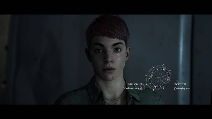 Por exemplo, a minha primeira experiência com o jogo foi através do modo Movie Night, como já referi anteriormente. Uma das primeiras falas que ouvimos no início da aventura é a do professor universitário John, que afirma ter deixado o álcool e estar bastante satisfeito com essa decisão. Pouco depois do acidente, o primeiro local que exploramos é um bar decadente, onde John é convidado a beber um shot de whisky. A minha namorada escolheu imediatamente aceitar a bebida, ao que eu reagi com uma risada e comentei: “então não ouviste o homem a dizer no início que tinha problemas com álcool? Acabaste de o condenar à morte!”. Para minha surpresa, tal não aconteceu. No entanto, essa escolha não foi inconsequente, algo de que só me apercebi mais tarde, após várias sessões de jogo. No caso de John, aceitar o shot desbloqueia um traço negativo da sua personalidade e, sempre que isso acontece a uma personagem, as sequências de acção em que esta está envolvida tornam-se mais exigentes, com tempos de reacção mais curtos. Achei este detalhe particularmente interessante, não só por ser uma alteração muito subtil e fácil de passar despercebida, mas também porque os traços negativos das personagens acabam por ter um peso relevante na própria narrativa. Pelo meio, o Curador vai-nos dando algumas pistas sobre o que está a acontecer, embora confesse que certas dicas, como o conhecido truque das cartas, me pareceram excessivamente crípticas e difíceis de interpretar, sobretudo numa primeira sessão de jogo.