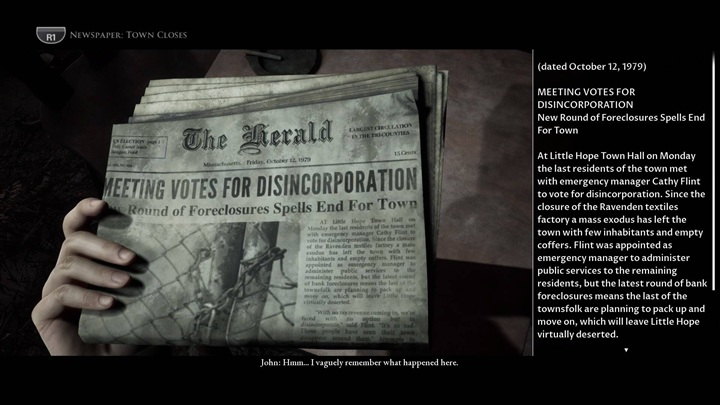 A nível audiovisual, considero que Little Hope é um jogo bastante competente. A pequena vila, largamente abandonada durante os anos 70, apresenta-se num estado de grande degradação que, em conjunto com o nevoeiro constante e a atmosfera sinistra, contribui para um ambiente permanentemente tenso. Uma vez mais, joguei a versão de PS5 visto haver um upgrade gratuito em relação à versão original. E comparando com a versão PS5 do Man of Medan, devo dizer que notei uma boa melhoria no que toca especialmente às animações faciais das personagens e o seu movimento, parecendo agora mais natural. Voltando à atmosfera, devo também dizer que este jogo foi mais do meu agrado. A atmosfera é tensa, não só por todo o nevoeiro envolvido que nos causa uma sensação constante de desconforto e expectativa que algo surja do nada para nos atacar, mas também pelo facto daqueles “jump scares” gratuitos serem menos frequentes. O voice acting é sólido no geral, embora confesse que inicialmente estranhei alguns dos diálogos e a hostilidade evidente entre as personagens. Algo que acaba por fazer mais sentido à medida que nos apercebemos do rumo que a narrativa toma. Mais uma vez, o papel do Curador deixa-me intrigado e fico bastante curioso para perceber como esta personagem irá evoluir nos títulos seguintes.