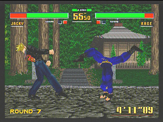 Se leram o meu artigo sobre o Virtua Fighter 1 para Saturn, sabem que o lançamento desse jogo para esta plataforma foi bastante atabalhoado, resultando num produto final ainda algo inacabado. Essas falhas notavam-se principalmente na parte gráfica, com gráficos muito inferiores aos da versão Arcade e repletos de bugs. A jogabilidade apesar de não ser má também não era muito fluida. A Sega resolveu muitos desses problemas ao lançar uma versão Remix do jogo mais tarde. Agora com Virtua Fighter 2, a Sega aprendeu a lição e conseguiram fazer um excelente trabalho. Concebido inicialmente para a placa Sega Model 2 (muito mais poderosa que a Sega Saturn ou qualquer outra consola no mercado na altura), Virtua Fighter 2 primava por ter excelentes gráficos 3D a correr em 60fps lisinhos, bem como uma jogabilidade melhorada (mais complexa). Ao fazer-se a conversão para a Saturn é natural que alguns sacrifícios tiveram de ser feitos. Os lutadores têm menos polígonos e os cenários são menos detalhados, uma diferença grande reside nas imagens de fundo das arenas. Enquanto que na Saturn as imagens de fundo são estáticas (embora sejam modelos 3D na mesma), na versão Arcade os modelos 3D de fundo “movem-se” de acordo com a câmara. A Saturn também perdeu as sombras “reais” dos lutadores, sendo substituídas por apenas círculos. Mas ainda assim, visto o hardware da Model 2 ser tão avançado para a altura, a conversão Saturn é excelente. Os gráficos continuam óptimos, a acção continua a 60fps sem falhas e é um dos poucos jogos que correm na mais alta resolução disponível na Saturn (720×525), resolução essa que a PS1 não consegue correr. Virtua Fighter 2 para a Saturn foi um autêntico murro no estômago para quem dizia que a Saturn era muito fraquinha para correr jogos 3D. Sim, foi uma consola extremamente difícil de se programar, mas nas mãos certas milagres destes aconteciam.